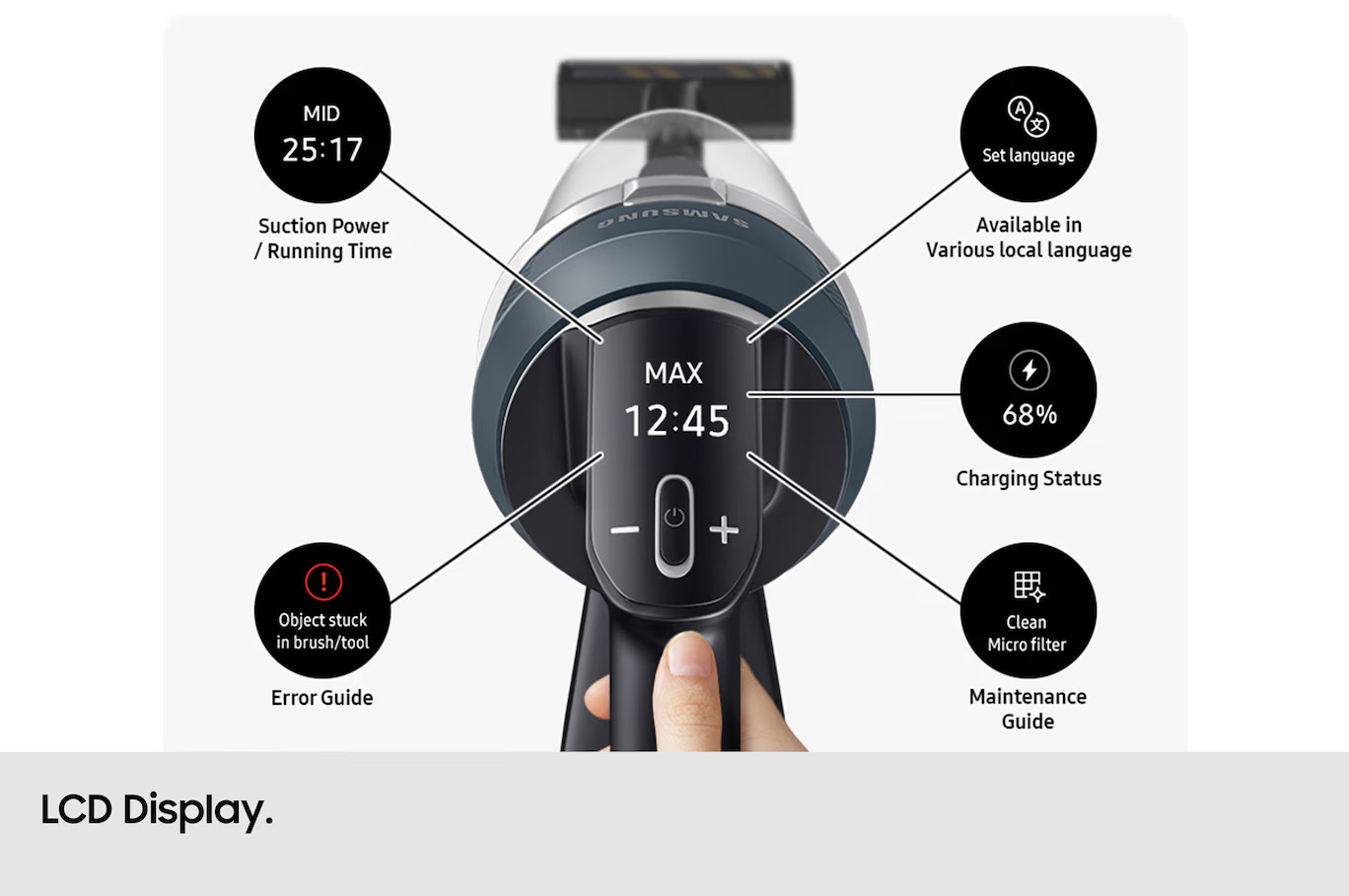 LCD digital display; Jet Dual system; Dust collection system: Multi Cyclone; Removable battery; Battery type: Li-Ion; Digital Inverter motor: HexaJet; Pre-Engine; Discharge: Fine dust filter; Washable tank; Rubber nozzle and bristle; Up to 135,000 rpm; 9 Vortexes equipped with 27 inputs; Charging time: 230min; Multilayer Filter Sanitizing function; Jet Cyclone ; Cordless: Yes; Vertically located: Yes; Spear: Yes |